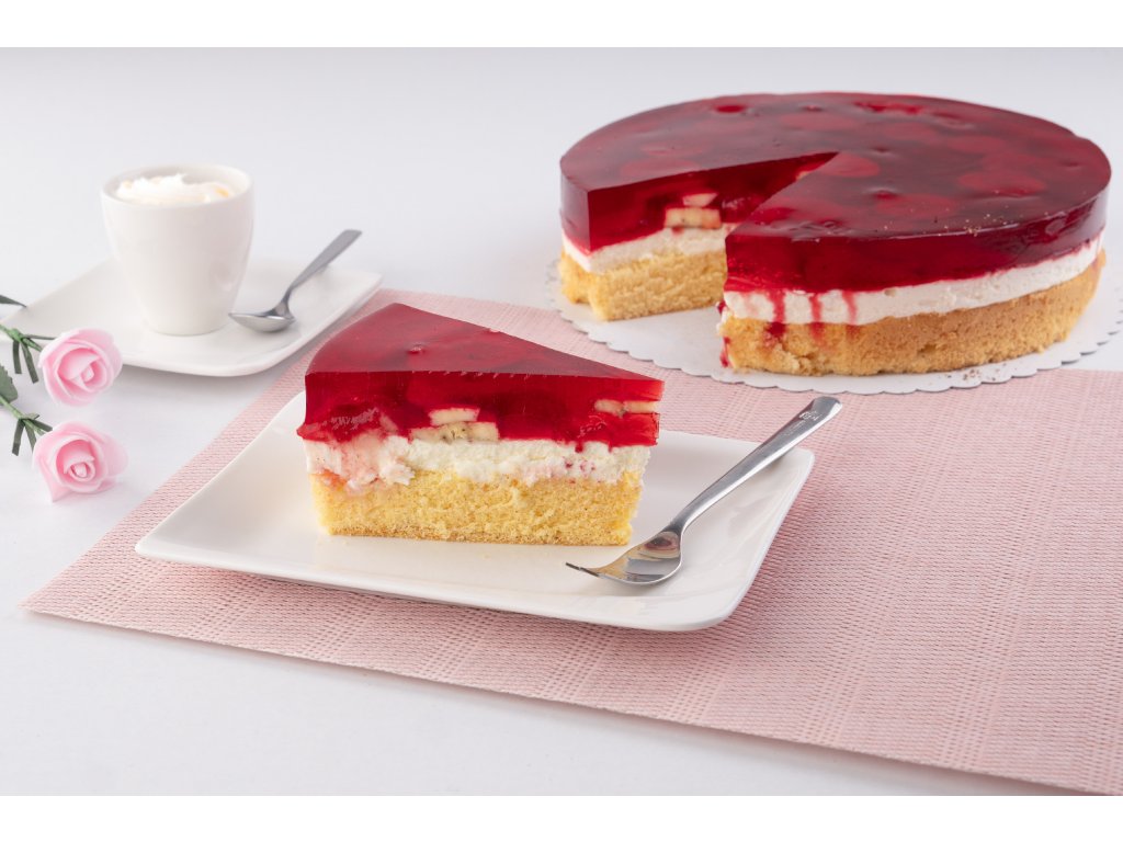 Složení: světlý korpus, smetanový krém, jahody, banán, želatina