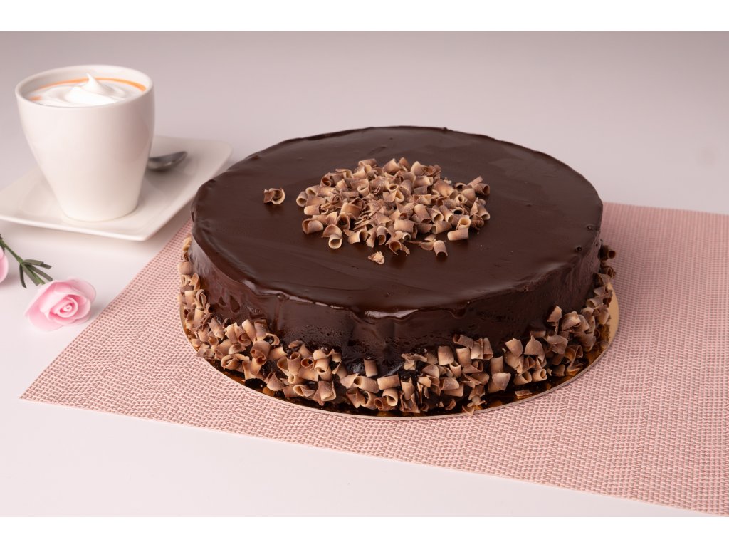 Složení: tmavý korpus, čokoládový krém, čokoláda