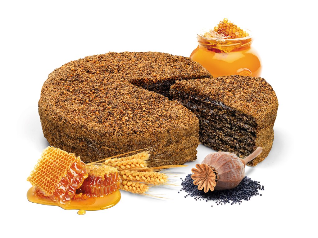 Základem jsou jemné zlatavé medové plátky, které jsou bohatě promazané lahodnou makovou náplní a jemným krémem – jejich překvapivá kombinace vytváří dokonalou harmonii chutí, která vás okamžitě nadchne. Celý dort je následně obalený v křupavé medovníkové drobence a ozdobený posypkou z vlašských ořechů, která dodává každému kousku jedinečnou texturu a nezapomenutelnou chuť.