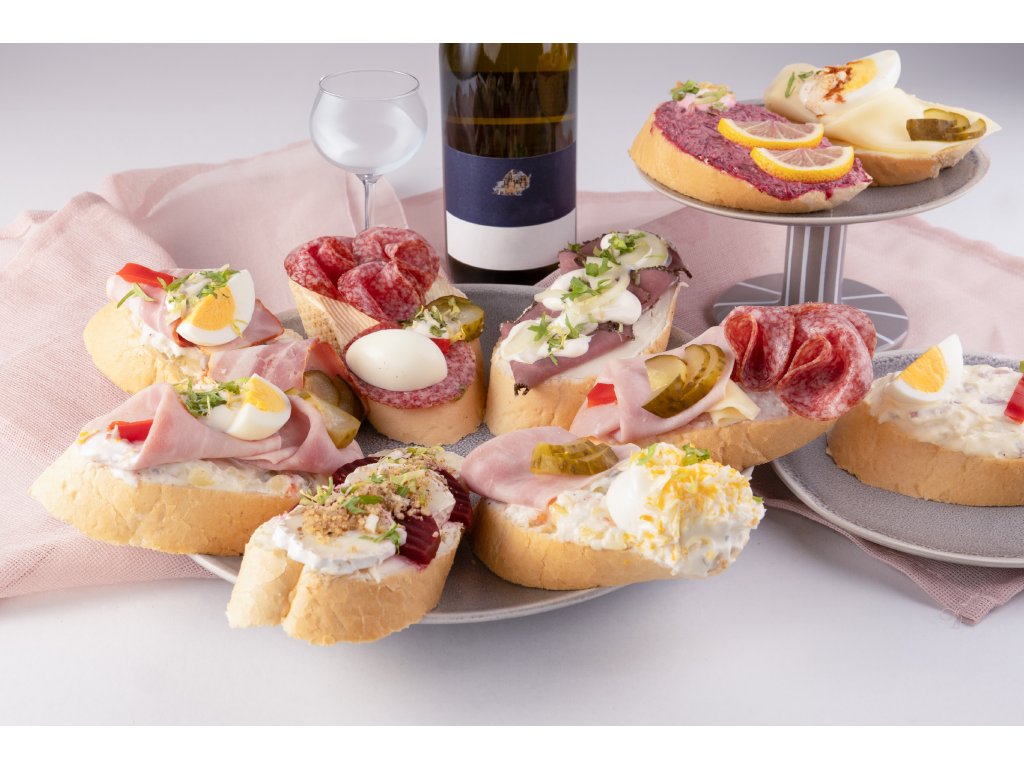 - 10ks svátečních chlebíčků - čerstvá veka pomazána šunkovou pěnou, se salámem, sýrem, šunkou, okurkou, paprikou a okurkou.