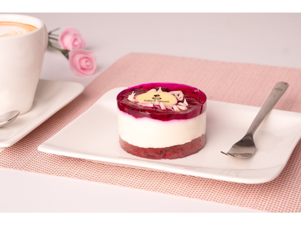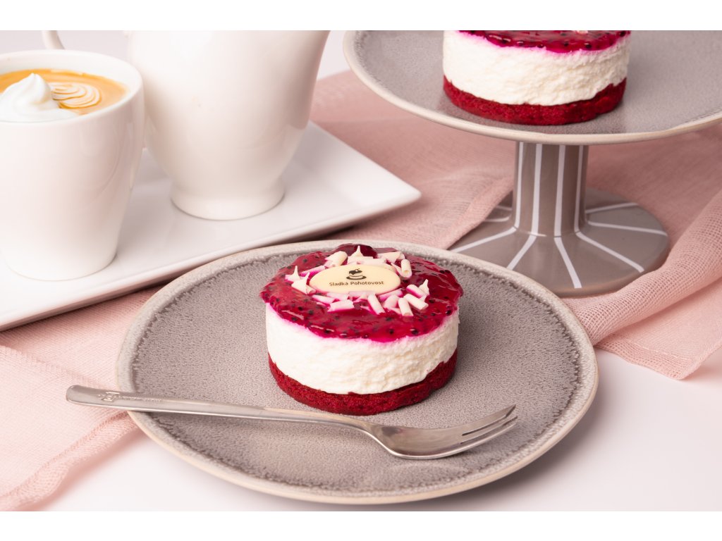 Jiskřivě růžový gel z pravého dračího ovoce korunuje celou kompozici. Zákusek je díky němu nejen chuťovou, ale i vizuální bombou – přesně to, co chcete na každém slavnostním stole nebo při každé speciální příležitosti.